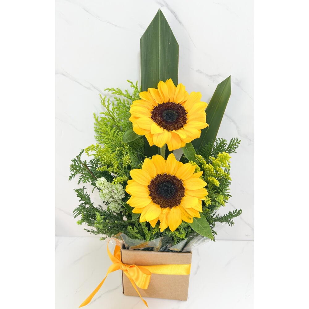 Este arranjo de flores traz o brilho do sol para sua casa com seus 2 girassóis vibrantes, cuidadosamente combinados com 1 unidade de elegantes folhagens. Servidos numa caixa artesanal delicada e finalizados com um sofisticado laço de cetim, estes arranjos são perfeitos para alegrar seu espaço ou surpreender alguém especial. Um toque de natureza que combina estética e emoção.