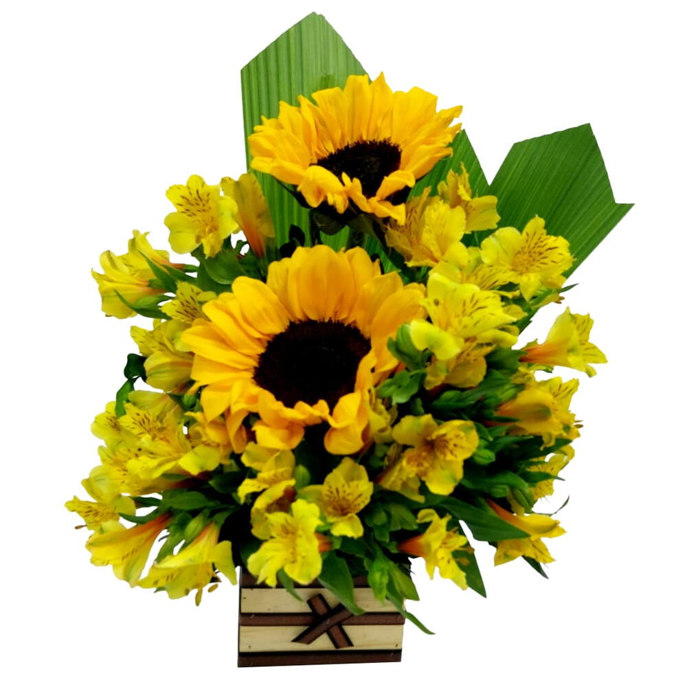 Descubra a alegria e a beleza do nosso arranjo floral com girassóis. Este lindo conjunto inclui dois girassóis vibrantes que capturam a energia e a alegria do verão. Também vem com um cachepot elegante para finalizar a peça com sofisticação. Além disso, a adição de uma unidade de folhagens completa a composição, trazendo um toque de verde fresco. Esses arranjos de flores são perfeitos para adicionar um toque de natureza e vivacidade em sua casa ou escritório.