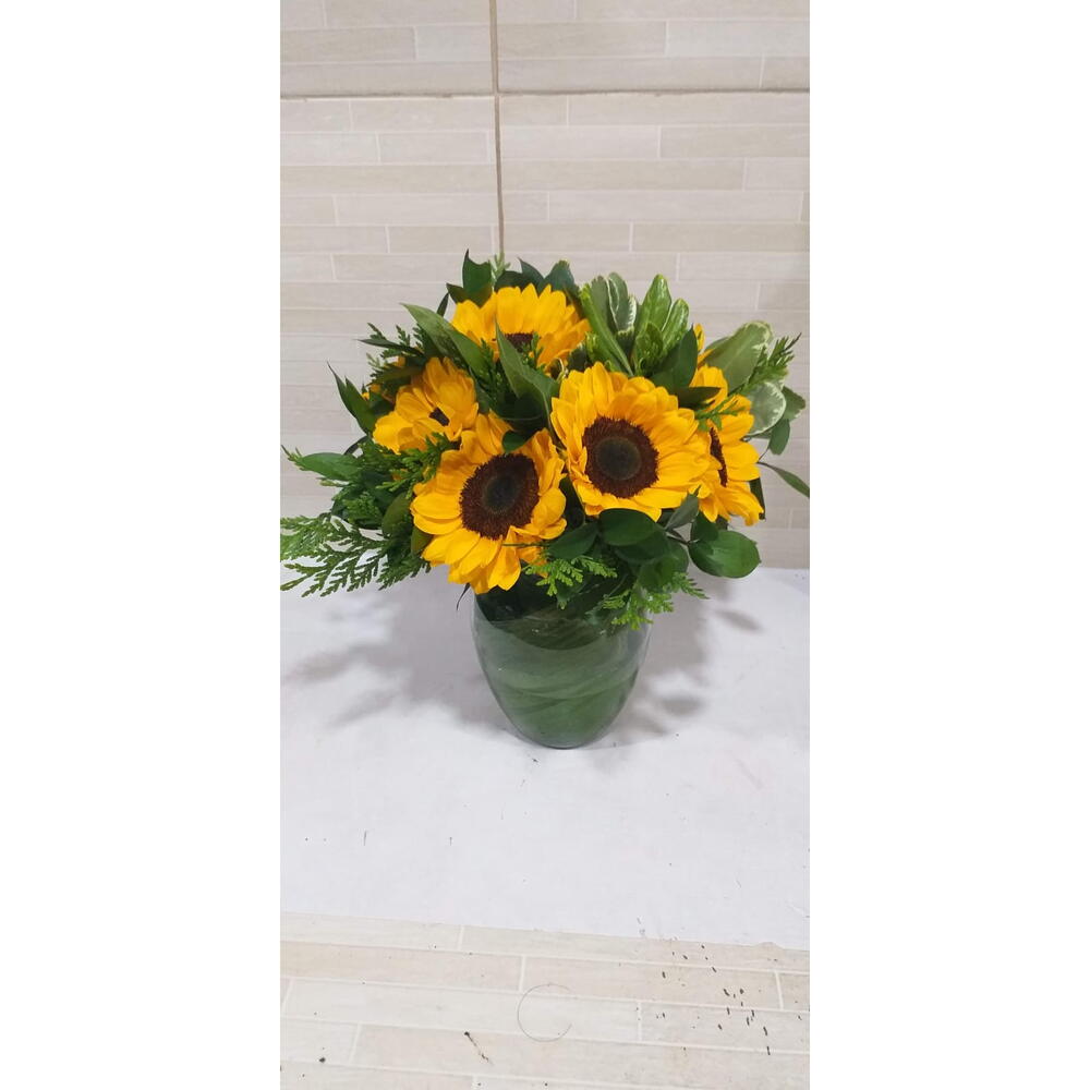 Este arranjo de flores é composto por 10 vibrantes girassóis, majestosos em sua beleza e radiância, delicadamente arranjados em um elegante vaso de vidro, complementado com uma união de folhagens verdes exuberantes para criar uma atmosfera de frescura e vivacidade. Este arranjo é a personificação da alegria e do optimismo, perfeito para iluminar qualquer espaço com sua serenidade natural.