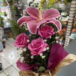 Um delicado arranjo com rosas exuberantes, combinadas com lírios e folhagens selecionadas. A composição é envolvida em embalagem rústica com toque sofisticado, trazendo harmonia entre elegância e aconchego. Perfeito para presentear em ocasiões especiais, expressando amor, carinho e admiração.