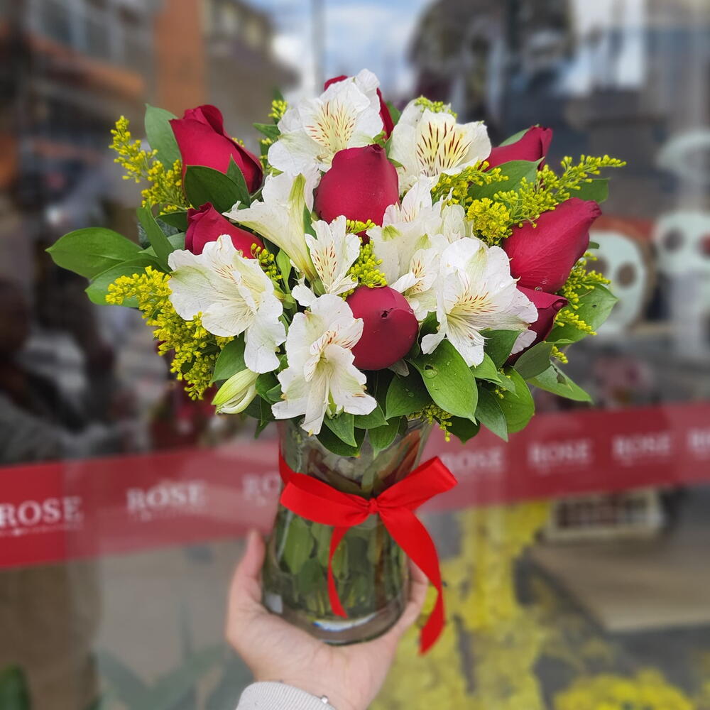 rosa - 8 un. vaso de vidro - 1 un. astroméria - 6 un.