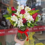 Encante qualquer ambiente com essa magnífica combinação de 8 rosas luxuosas emparelhadas com 6 astromérias deslumbrantes, apresentadas artisticamente em um vaso de vidro elegante. Essa disposição floral exala uma beleza natural sofisticada que certamente atrairá admiração. Ideal para presentear alguém especial ou para estilizar sua própria casa.