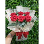 Este buquê foi cuidadosamente projetado para impressionar com sua elegância e sutileza. Composto por seis rosas vermelhas de alta qualidade, posicionadas de forma estratégica para destacar sua beleza exuberante e vibrante. Adicionalmente, possui quatro hastes de eucalipto intimamente entrelaçadas para aggiornar ao arranjo um charme etéreo e fragrância agradável, enquanto uma unidade de folhagem acrescenta um toque de verdejante frescor. Envolve todo este espetáculo floral, uma embalagem do modelo coreano, conhecida pela sua sofisticação e apelo estético. Para completar, um laço de cetim adiciona o toque final, conferindo um ar de luxo e refinamento ao arranjo. Sem dúvida, é um presente capaz de transmitir emoções intensas, ideal para datas especiais ou para simplesmente surpreender a pessoa amada.