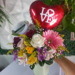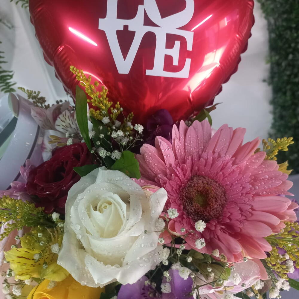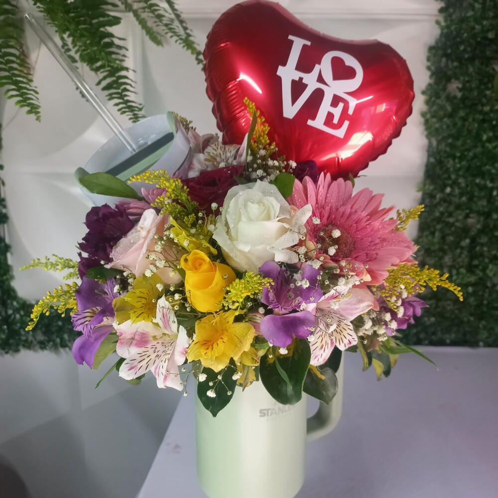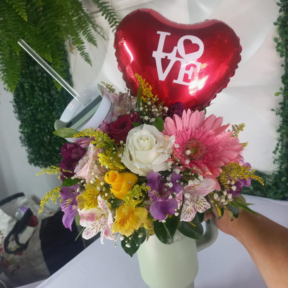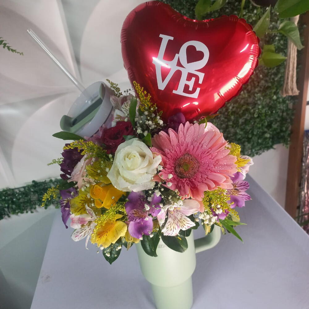 balão personalizado - 1 un. folhagens especias - 1 un. copo stanley 1200mls - 1 un. um arranjo com misto de flores - 1 un.
