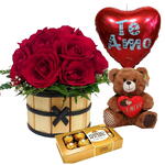 Desperte sorrisos com este encantador kit de presente. Composto por um balão festivo, um delicioso bombom Ferrero Rocher, um cachepot com 12 rosas vibrantes e um adorável ursinho de pelúcia de 20 cm. Cada item foi selecionado cuidadosamente para proporcionar alegria e amor. É o presente perfeito para aniversários, datas comemorativas ou simplesmente para apreciar alguém especial.