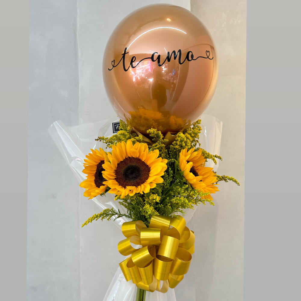 embalagem - 1 un. folhagens - 1 un. girassol - 3 un. balão - 1 un. laço - 1 un.