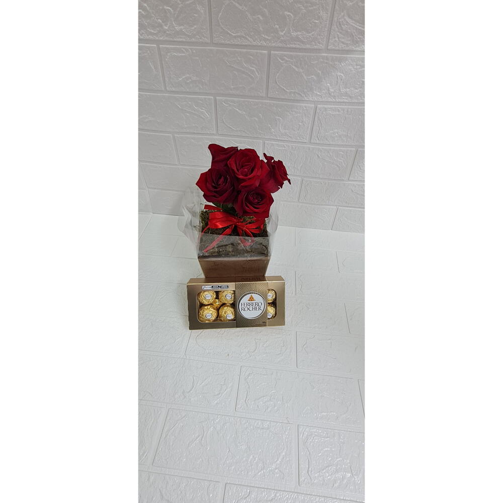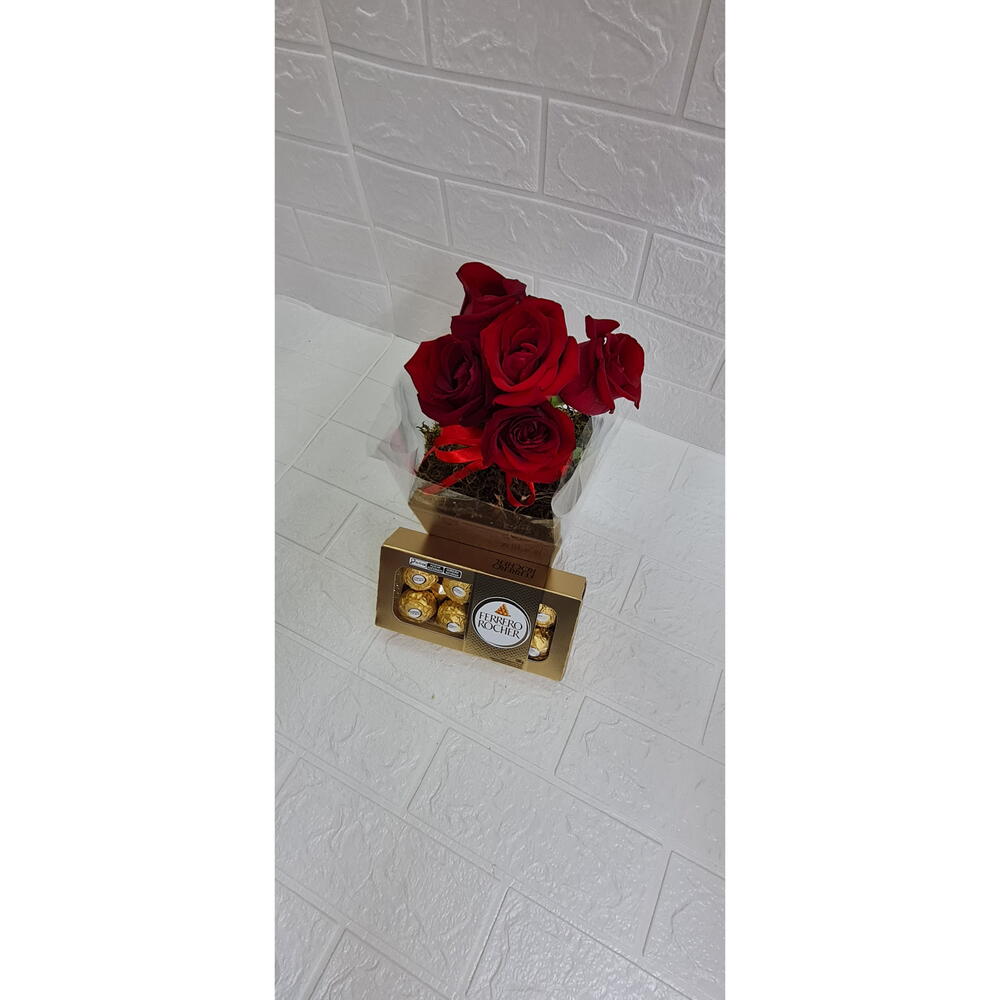 Descubra o prazer de dar e receber com este presente encantador, repleto de doçura e carinho. Com uma composição de cinco rosas vibrantes, uma bela folhagem, uma caixa elegante de MDF e um pacote com oito unidades irresistíveis de Ferrero Rocher, este é o presente perfeito para marcar qualquer ocasião especial. Encante os seus amados com esta mistura perfeita de romance e indulgência.
