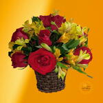 Arranjo de Astromélias amarelas e com rosas vermelhas! 10 unidades. Ideal para presentear alguém a quem sente saudades e amor profundo.