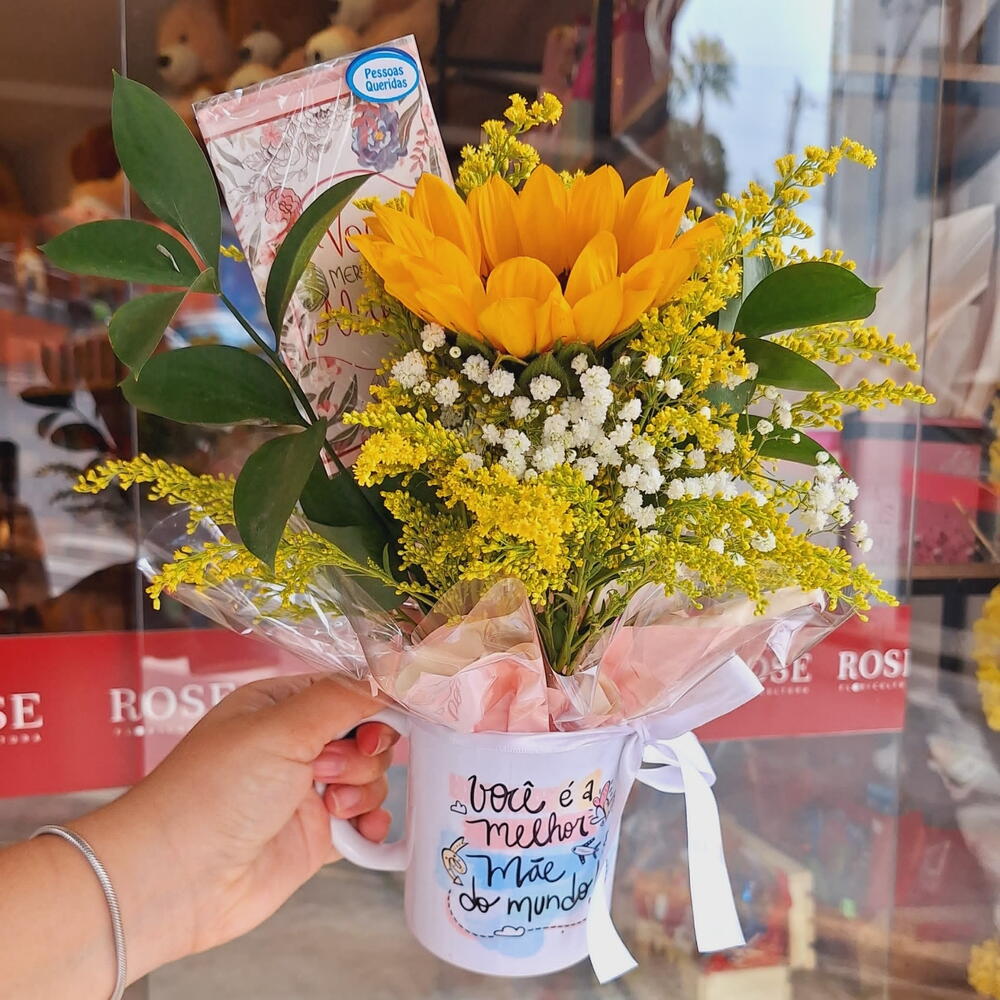 embalagem - 1 un. girassol - 1 un. cartão personalizado - 1 un. caneca - 1 un. laço em cetim - 1 un.