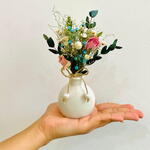 Um buquê que cabe na palma da mão, mas transborda sentimento. Neste pequeno vaso de cerâmica branca, adornado com cordão de sisal e pérolas, mora um jardim delicado de flores desidratadas. Tons suaves de rosa e champanhe se misturam com folhagens verdes e toques de azul vibrante — como se cada detalhe tivesse sido colhido direto de um sonho campestre. Ideal para presentear com afeto ou decorar com poesia. Um mimo atemporal, feito para durar e encantar.
