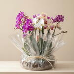 Conjunto de mini orquídeas em arranjos coloridas com embalagem rústica