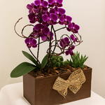 A união perfeita entre a paixão e a força da natureza! ❤️🌵 Apresentamos nosso exclusivo arranjo combinando uma deslumbrante Orquídea Phalaenopsis de um intenso tom púrpura/magenta, com hastes florais ricas e vibrantes. Esta beleza é cuidadosamente montada em uma caixa retangular de madeira escura, conferindo um toque rústico-chique ao design. Para complementar e trazer textura, adicionamos suculentas variadas (incluindo uma pequena planta do gênero Aloe), criando um contraste visual marcante. O toque final fica por conta de um charme laço de juta (sisal) na lateral da caixa, simbolizando um presente feito com carinho e atenção aos detalhes. Este arranjo é ideal para presentear alguém especial, decorar um ambiente contemporâneo ou trazer um ponto de cor profundo e elegante para a sua casa ou escritório. Produto assinado pela Flores da Vila.