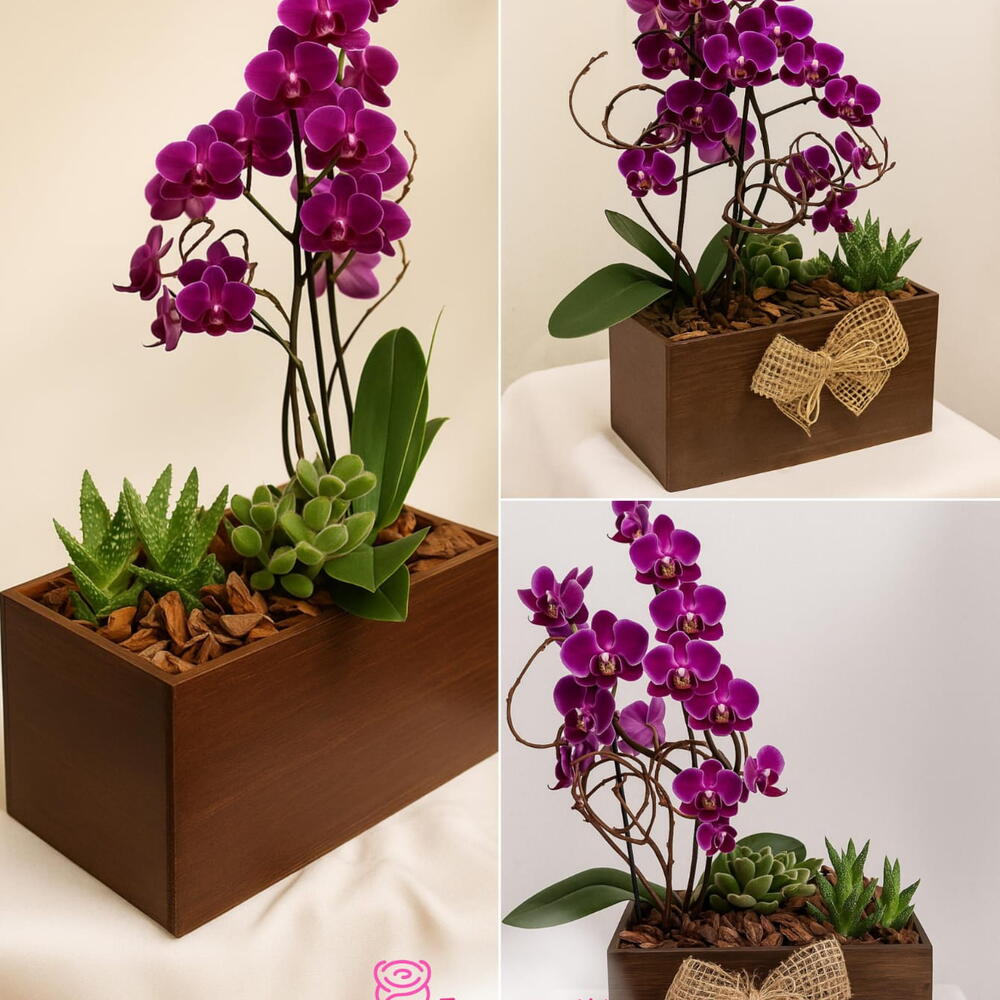 A união perfeita entre a paixão e a força da natureza! ❤️🌵 Apresentamos nosso exclusivo arranjo combinando uma deslumbrante Orquídea Phalaenopsis de um intenso tom púrpura/magenta, com hastes florais ricas e vibrantes. Esta beleza é cuidadosamente montada em uma caixa retangular de madeira escura, conferindo um toque rústico-chique ao design. Para complementar e trazer textura, adicionamos suculentas variadas (incluindo uma pequena planta do gênero Aloe), criando um contraste visual marcante. O toque final fica por conta de um charme laço de juta (sisal) na lateral da caixa, simbolizando um presente feito com carinho e atenção aos detalhes. Este arranjo é ideal para presentear alguém especial, decorar um ambiente contemporâneo ou trazer um ponto de cor profundo e elegante para a sua casa ou escritório. Produto assinado pela Flores da Vila.