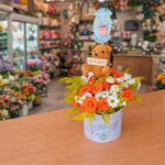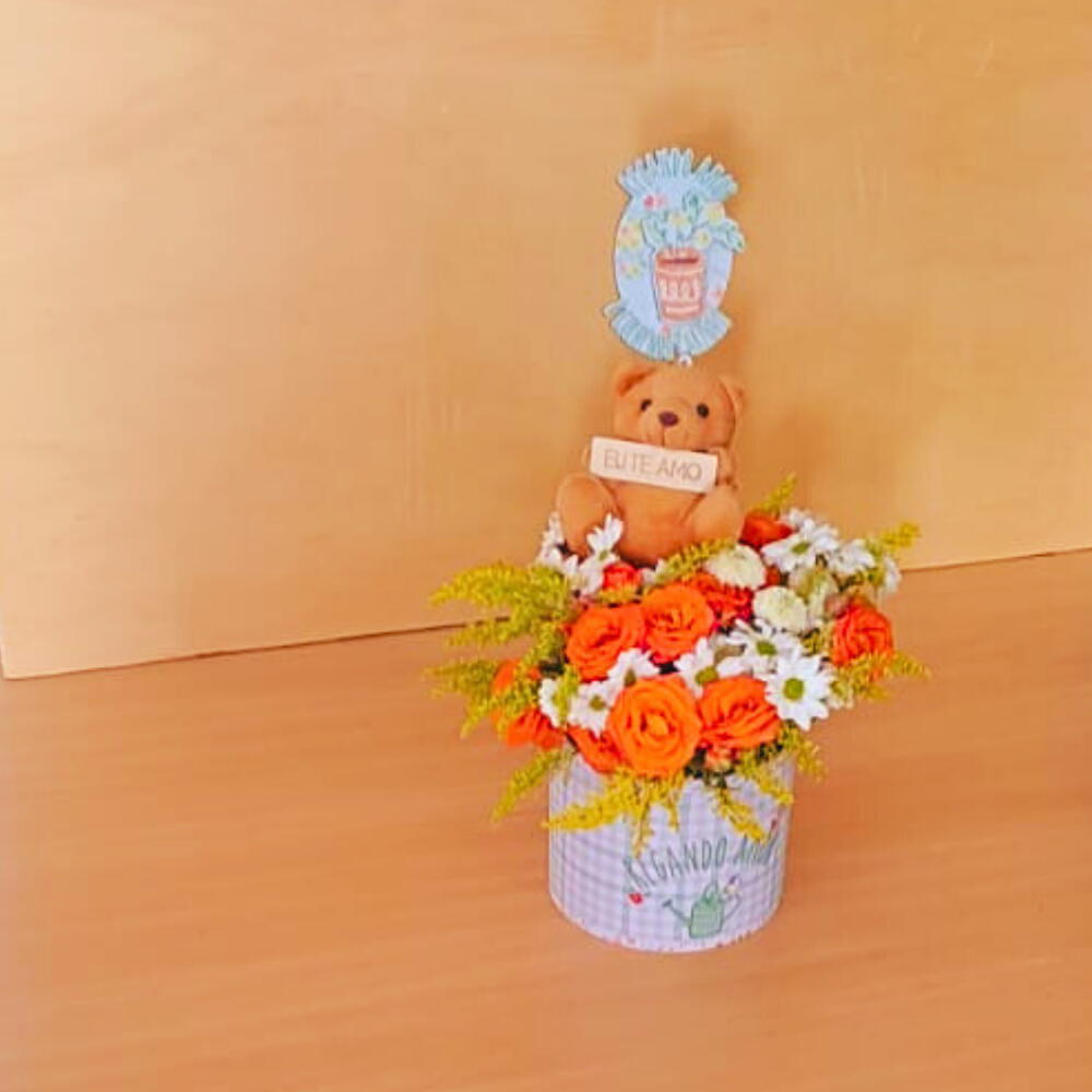folhagens - 1 un. urso de pelúcia - 1 un. plaquinha - 1 un. arranjo com flores variadas - 1 un.