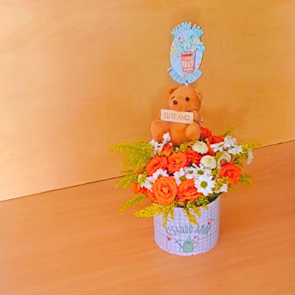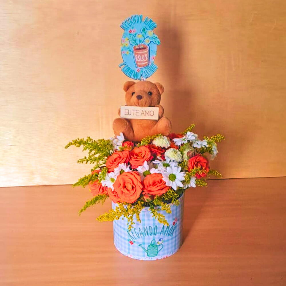 Arranjo Regando Amor com Flores Variadas – Um Presente que Encanta e Aquece Corações Surpreenda quem você ama com este arranjo floral delicado e cheio de significado. O Arranjo Regando Amor traz uma seleção de flores variadas cuidadosamente fixadas em esponja floral, garantindo frescor e beleza duradouros. Por que escolher este arranjo? Este arranjo é apresentado em um vaso de acrílico elegante, decorado com a frase Regando Amor em destaque, acompanhado de um charmoso pick de MDF de 30 cm com uma plaquinha que reforça a mensagem de carinho. Além disso, inclui um mini urso de pelúcia de 10x10 cm com a inscrição Eu te amo, tornando a surpresa ainda mais especial. Detalhes do Produto Flores variadas frescas, harmoniosamente combinadas para encantar. Fixação em esponja floral que mantém as flores hidratadas por mais tempo. Vaso de acrílico com design moderno e frase inspiradora. Pick de MDF com plaquinha decorativa de 30 cm. Mini urso 10x10 cm com mensagem romântica. Medidas aproximadas do arranjo : 20 cm de altura e 20 cm de diâmetro. Benefícios Exclusivos Presente pronto para emocionar com uma apresentação sofisticada e delicada. Combinação perfeita entre flores naturais e um toque fofo com o ursinho. Ideal para datas especiais como aniversários, Dia dos Namorados, ou simplesmente para demonstrar amor e carinho.