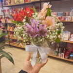 vaso de vidro - 1 un. laço em cetim - 1 un. astromélia rosa - 1 un. astromélia lilás - 1 un. astromélia vermelha - 1 un.