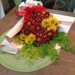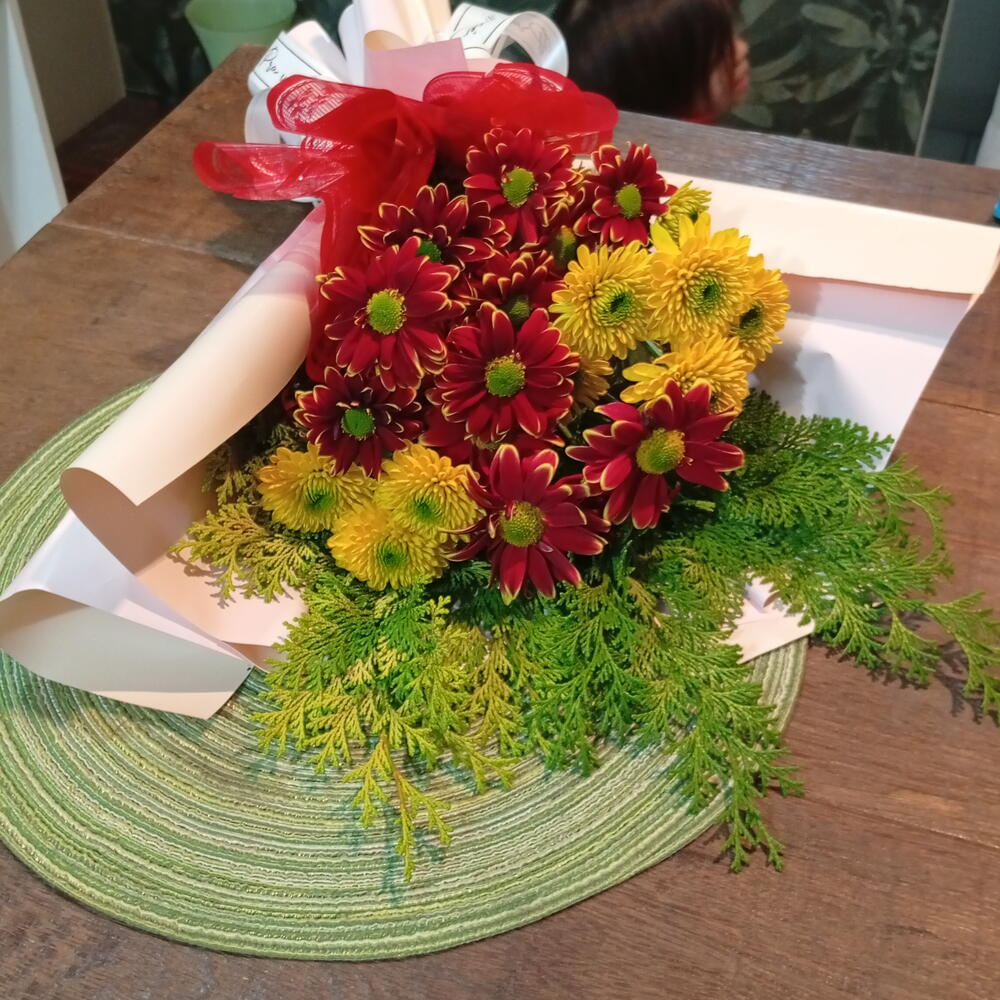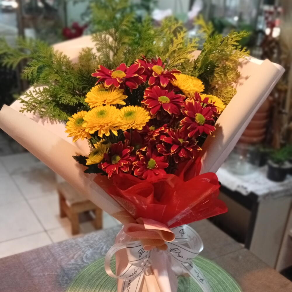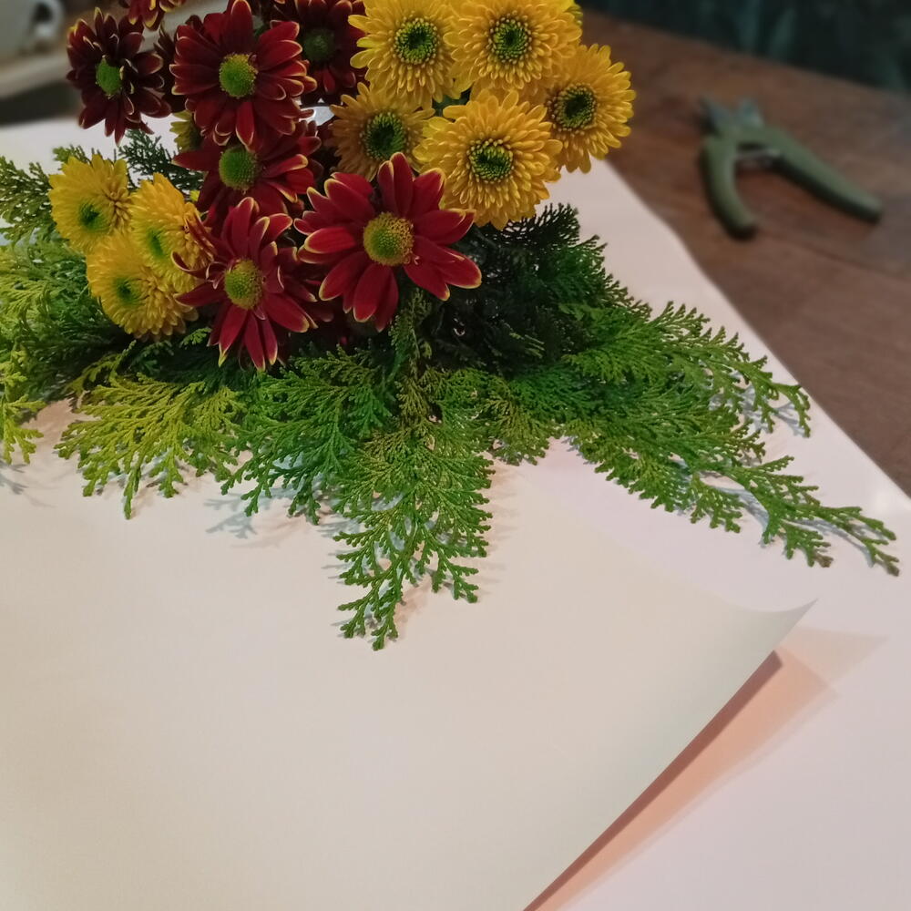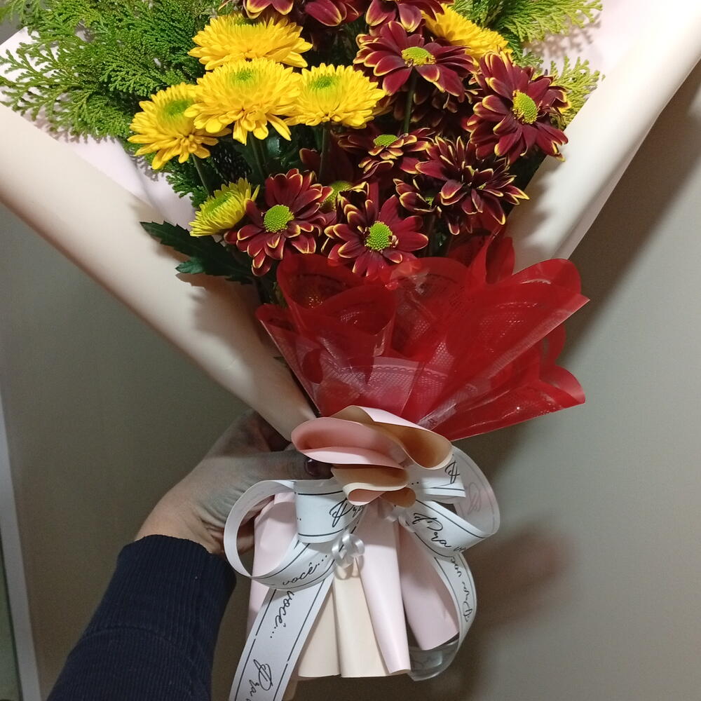 flores de campo variadas entre crisântemo e margaridas - 5 un. tuia verde - 1 un. embalagem dupla face cor a escolha - 1 un. laço bola fita maxi - 1 un. pode ser adicionado mais flores - 1 un.