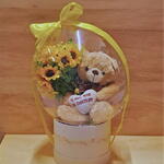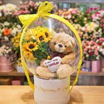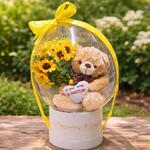 Balão Bubble com girassois artificias, urso de pelucia e chocolates