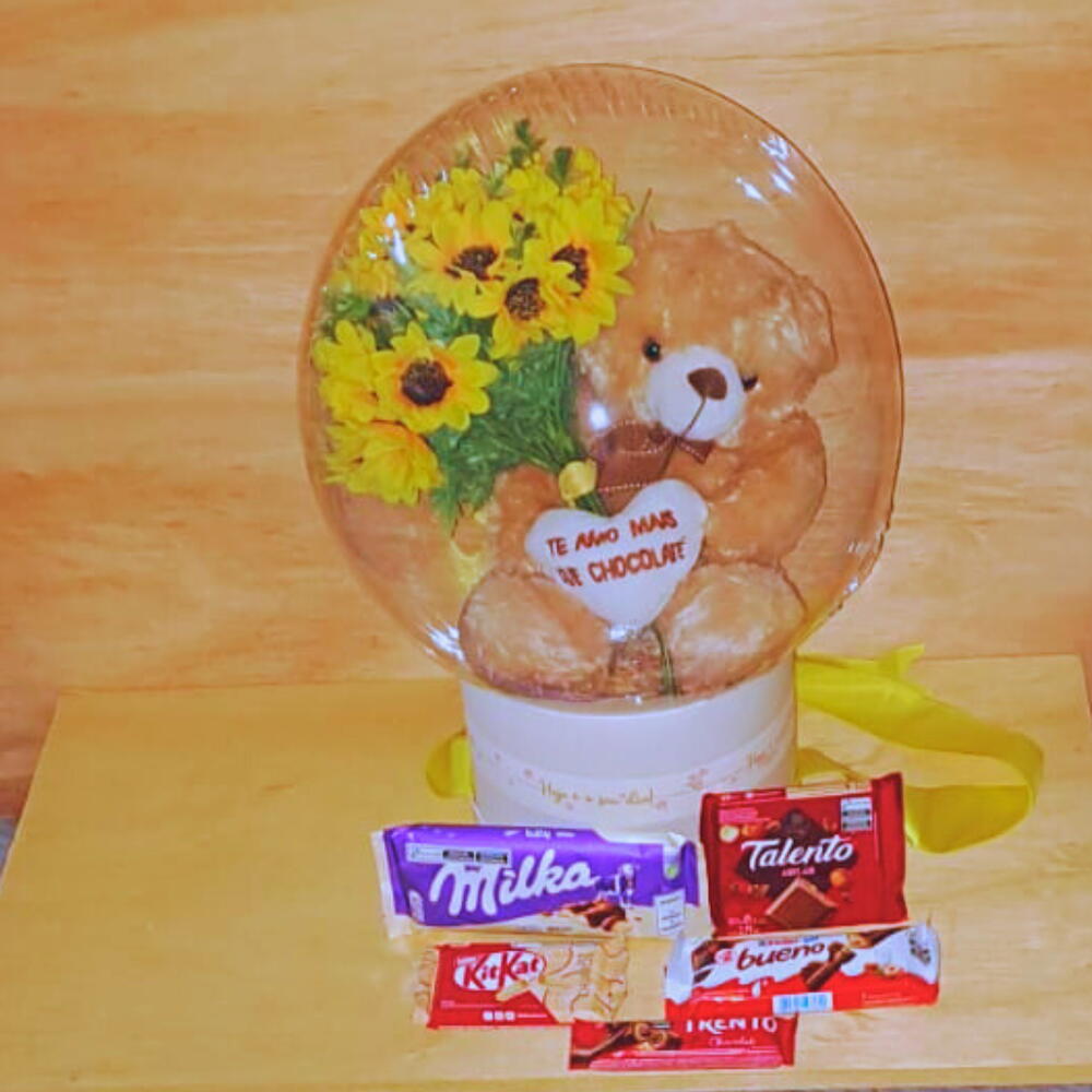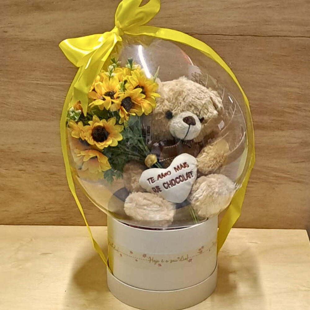 Balão Bubble com girassois artificias, urso de pelucia e chocolates