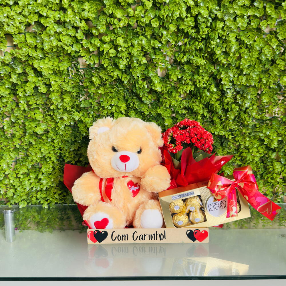 Um presente delicado, romântico e cheio de significado! Este kit especial vem em uma bandeja decorada com muito cuidado e amor, e acompanha: • 🧸 1 Pelúcia fofa – perfeita para transmitir afeto • 🌸 1 Flor Kalanchoe – charmosa e cheia de vida • 🍫 1 Caixa de Ferrero Rocher (8 bombons) – sabor refinado para adoçar o momento ✨ Ideal para presentear com carinho em aniversários, datas especiais, surpresas românticas ou simplesmente para dizer você é importante pra mim.