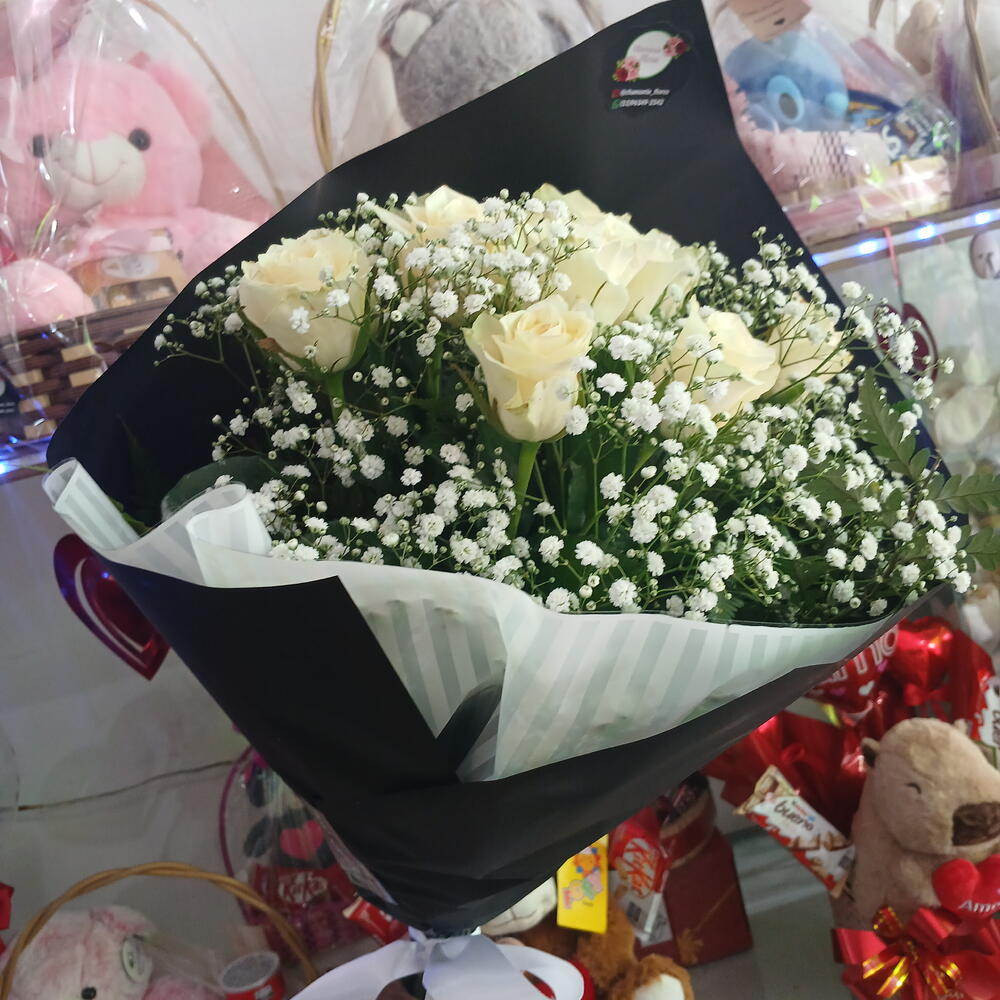 Este deslumbrante buquê é composto por 6 roses brancas majestosas, simbolizando o amor puro e sincero. Elas são delicadamente entrelaçadas com 5 espigas de egipsofila, também conhecidas como respiro do bebê, que adicionam um toque de elegância e sofisticação. Além disso, a folhagem vibrante incorporada, dá vida e frescura ao conjunto. Ideal para ocasiões especiais ou simplesmente para mostrar o seu amor de uma máneira tocante e memorável.
