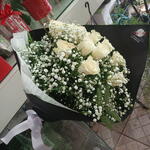 embalagem - 1 un. folhagem - 6 un. rosa brancas - 12 un. laço - 1 un. egypsofila - 5 un.