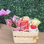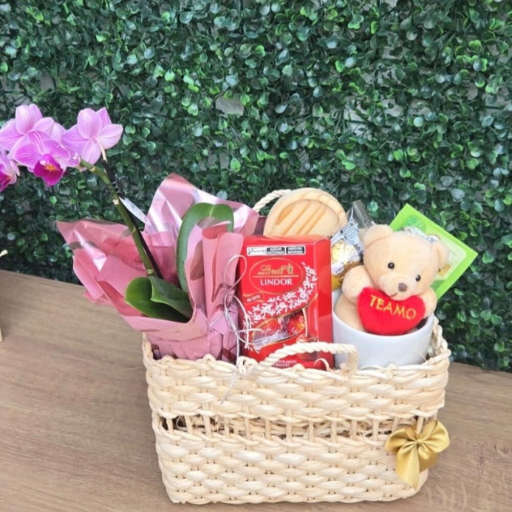 Bolsa de palha tamanho aproximado 23cm largurax15 cm altura, caneca personalizada com a inicial do nome 170 ml com colher de coração dourada e Pires de coração, chá inglês Twinings ( sabor disponível), cx bombom lindt com 4 unidades, 1 pct Ferrero rocher 3 un, mini ursinho eu te amo e mini Orquídea decorada. Acompanha tag, embalagem e sacola presenteável