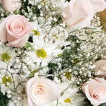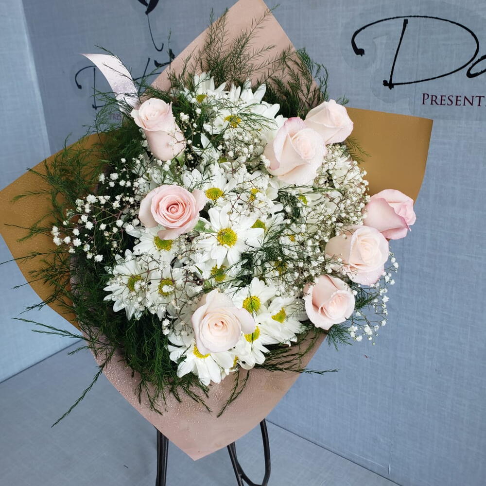 Este belo buquê, composto por 8 rosas meticulosamente selecionadas na cor disponível e combinadas com 4 margaridas, ganha vida graças às 6 hastes de folhagens. A adição de 4 unidades de Gipson torna este arranjo floral ainda mais especial. Ideal para presentear em momentos únicos ou para enfeitar seu lar com um toque de natureza e sofisticação.