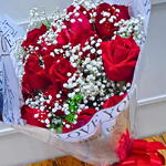 embalagem de designer - 1 un. laço - 1 un. rosa vermelhas - 20 un. maço de folhagens - 1 un. maço mosquitinho branco - 1 un.