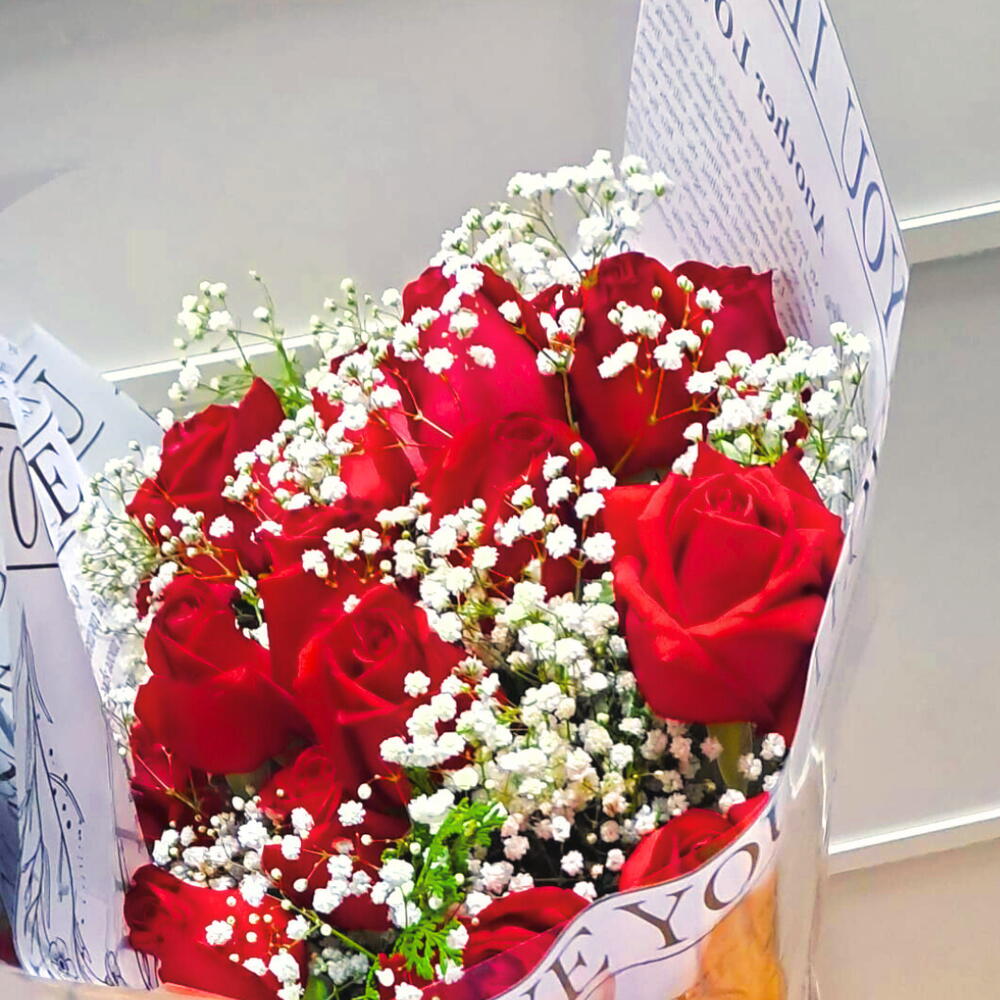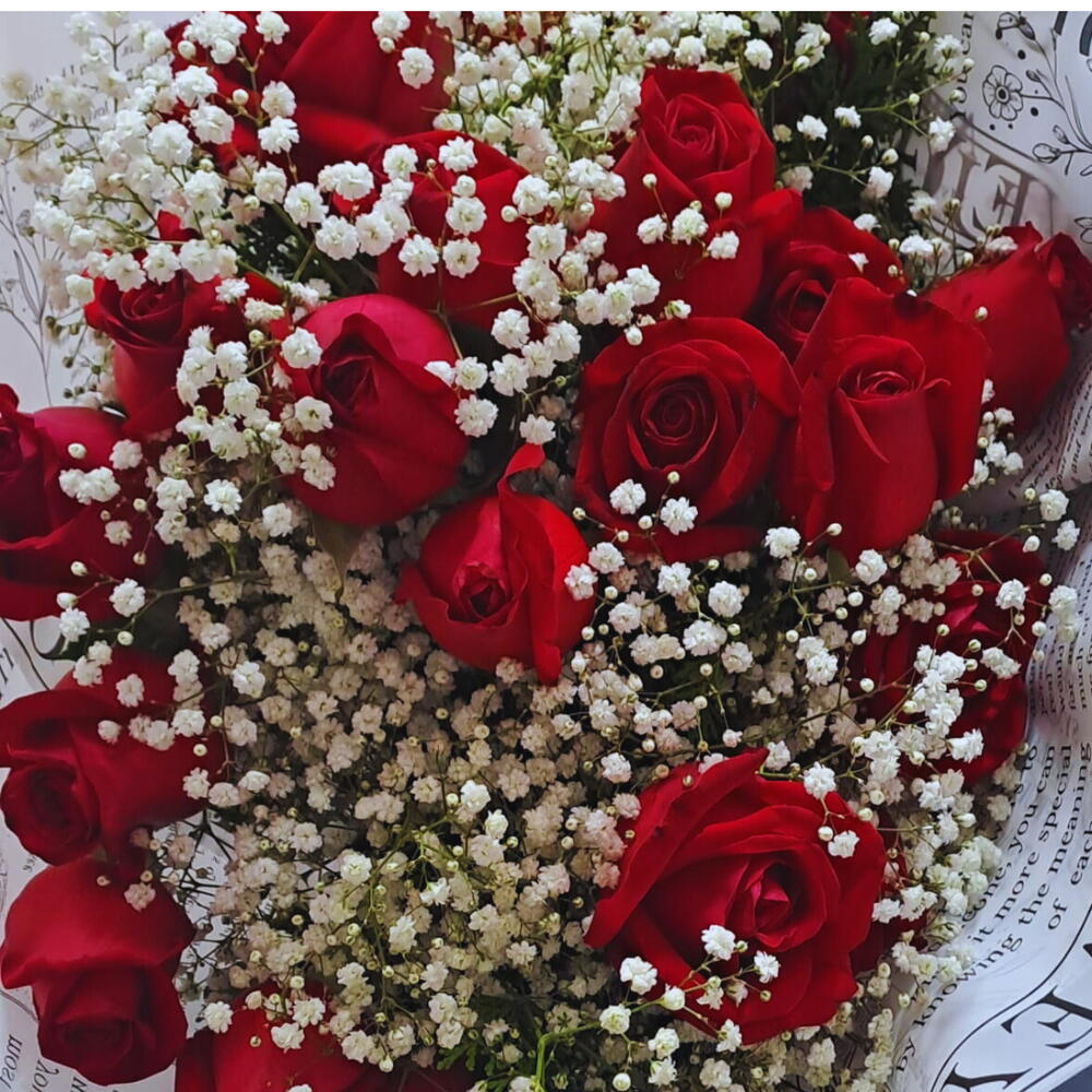 embalagem de designer - 1 un. laço - 1 un. rosa vermelhas - 20 un. maço de folhagens - 1 un. maço mosquitinho branco - 1 un.