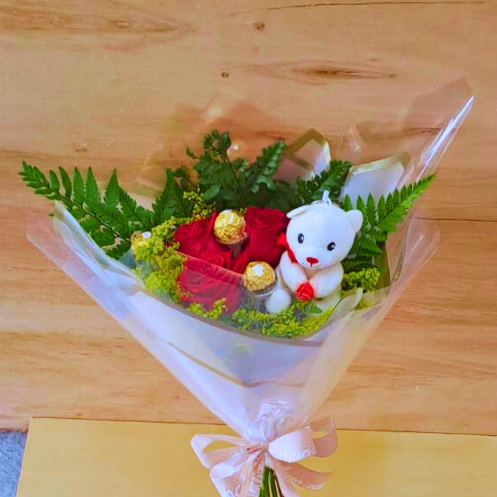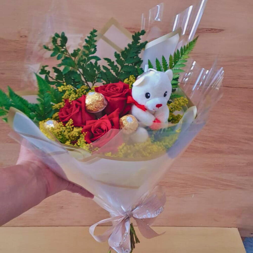 Bouquet 3 Rosas, Bombons e Mini Urso de Pelucia