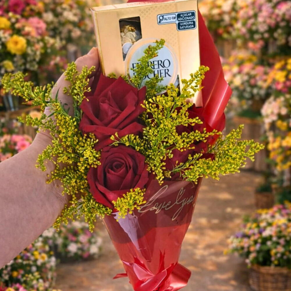 Bouquet 3 Rosas e Ferrero Rocher – Elegância e Doçura em um Só Presente Surpreenda quem você ama com o Bouquet 3 Rosas e Ferrero Rocher, uma combinação perfeita que une a delicadeza das flores naturais com o sabor sofisticado do bombom mais desejado do mundo. Detalhes do Bouquet 3 rosas frescas, cuidadosamente selecionadas para expressar carinho e romantismo. Vem acompanhado de uma caixa com 4 bombons Ferrero Rocher, para adoçar ainda mais o momento. Dimensões ideais: 45 cm de altura e 15 cm de diâmetro, proporcionando um arranjo compacto e elegante. Por que escolher este presente? As rosas simbolizam amor e admiração, enquanto o Ferrero Rocher, com seu sabor único e textura irresistível, é sinônimo de requinte e prazer. Juntos, formam um presente inesquecível para aniversários, Dia dos Namorados, ou qualquer ocasião especial. Cuidados para manter seu bouquet sempre lindo Mantenha as rosas em local com luz indireta. Troque a água diariamente para preservar a frescura das flores. Evite exposição direta ao sol e ambientes muito quentes. Garanta já o seu Bouquet 3 Rosas e Ferrero Rocher e transforme momentos especiais em memórias doces e românticas. Compre agora e encante com um presente que fala ao coração!
