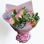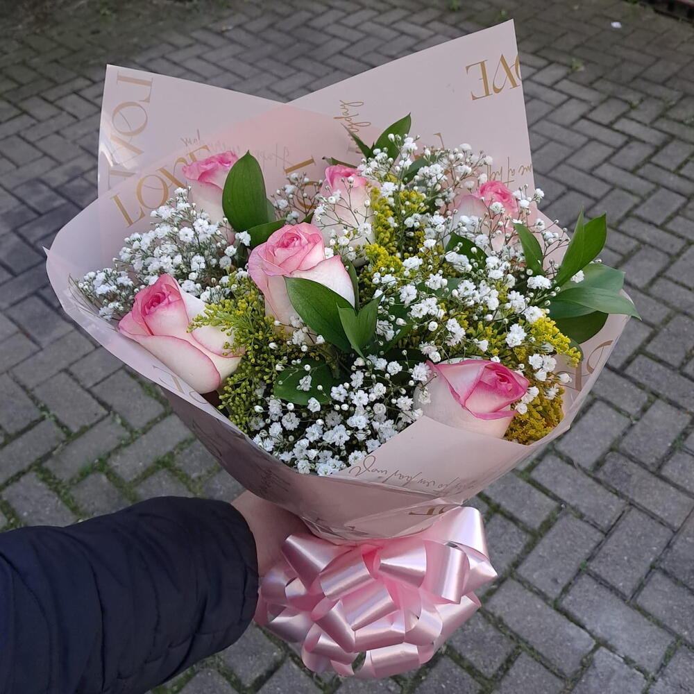 Este buquê encantador é composto por seis rosas lindamente dispostas, complementadas por uma única folhagem, dando-lhe um toque de frescura e naturalidade. Para um acabamento sofisticado, o arranjo é delicadamente embalado e amarrado com um laço elegante. Esta composição floral foi cuidadosamente pensada para criar uma expressão verdadeiramente romântica de carinho e admiração. Perfeito para expressar seu amor, amizade ou simplesmente para alegrar o dia de alguém.