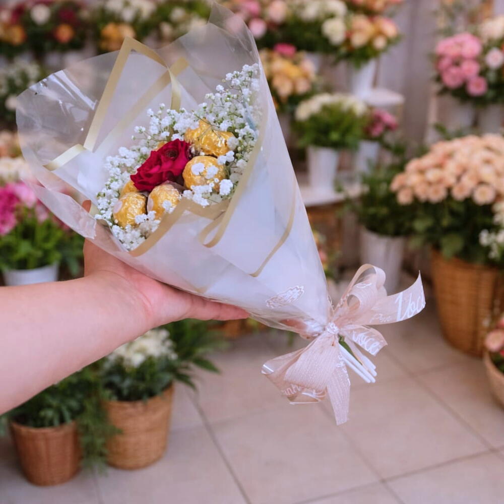 Bouquet com 1 Rosa e Bombons Ferrero Rocher – Um Presente Sofisticado e Delicioso Surpreenda quem você ama com o nosso Bouquet com 1 rosa vermelha acompanhado de 7 bombons Ferrero Rocher, uma combinação perfeita que une a beleza e o romantismo da flor com o sabor inconfundível do chocolate premium. Características do Produto 1 rosa vermelha de alta qualidade, símbolo clássico de amor e paixão. 3 hastes de mosquitinho, que dão leveza e elegância ao arranjo. 7 bombons Ferrero Rocher, reconhecidos mundialmente pela sua textura crocante e recheio irresistível. Dimensões: altura de 38 cm e diâmetro de 20 cm, ideal para decorar ou presentear com charme. Por que escolher este bouquet? Combinação exclusiva: A união perfeita entre a delicadeza da rosa e o sabor sofisticado dos bombons Ferrero Rocher. Presente que encanta: Ideal para ocasiões especiais como aniversários, Dia dos Namorados, ou simplesmente para demonstrar carinho. Design elegante: Um bouquet compacto, fácil de transportar e com visual refinado, que encanta à primeira vista. Transforme qualquer momento em uma data inesquecível com este bouquet que transmite amor, cuidado e bom gosto. Garanta já o seu Bouquet com 1 Rosa e Bombons Ferrero Rocher e surpreenda com um presente que fala ao coração!