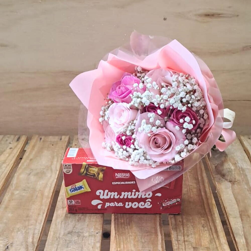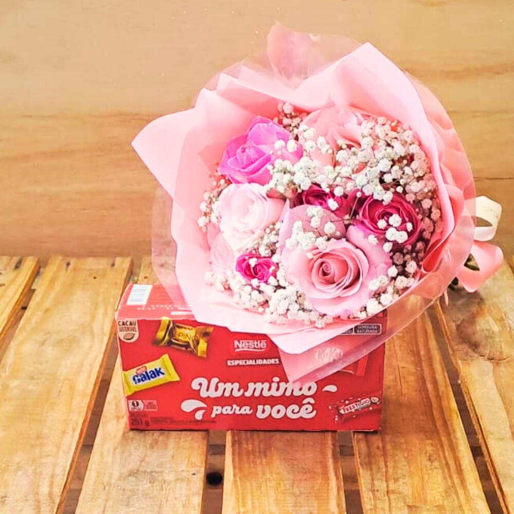 Bouquet com Rosas e Bombons – Um Mimo pra Você da Nestlé! Surpreenda de forma doce e delicada com este bouquet exclusivo que une a beleza das flores com o sabor irresistível dos bombons Nestlé. Um presente perfeito para demonstrar carinho, amor e atenção em qualquer ocasião especial. Detalhes do Produto: Bouquet com 8 rosas cor de rosa mescladas: flores frescas e encantadoras que trazem suavidade e romantismo ao arranjo. 1 caixa de bombons Nestlé de 251g, com embalagem litografada Um Mimo para Você, para adoçar ainda mais o momento. Dimensões do bouquet: altura de 50 cm e diâmetro de 25 cm — tamanho ideal para impactar e decorar ambientes com elegância. Por que escolher este bouquet? Este presente é ideal para surpreender quem você ama com um toque de sofisticação e doçura. A combinação das rosas delicadas com os bombons Nestlé cria uma experiência única, perfeita para datas como aniversários, Dia dos Namorados, ou simplesmente para dizer estou pensando em você. Cuidados para manter seu bouquet lindo por mais tempo: Mantenha as rosas em local fresco e protegido da luz solar direta. Evite ambientes muito secos para preservar a frescura das flores. Aproveite os bombons com moderação e compartilhe esse mimo especial! Garanta já o seu Bouquet com Rosas e Bombons Um Mimo pra Você da Nestlé e transforme momentos simples em memórias inesquecíveis com um presente que combina beleza, sabor e muito afeto. Porque quem recebe um mimo merece todo o carinho do mundo!