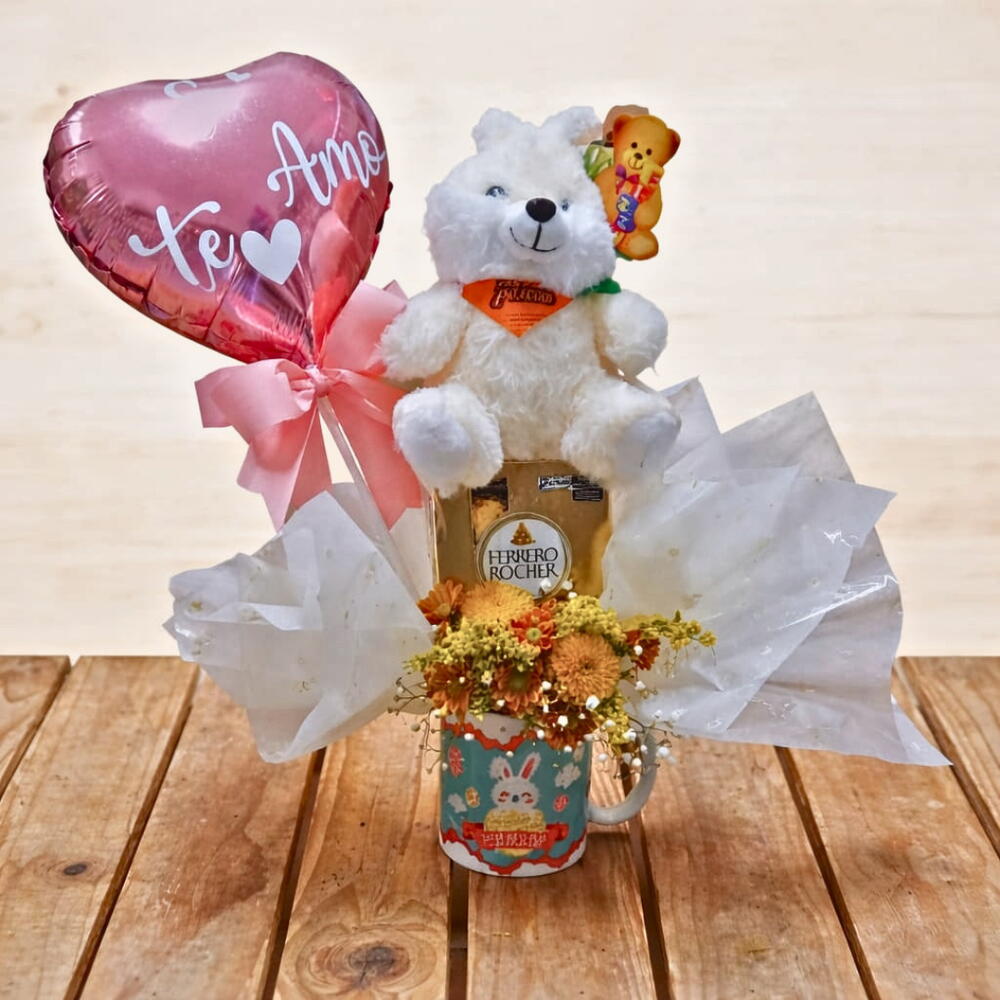 balão metalizado eu te amo - 1 un. caneca de cerâmica "feliz páscoa" - 1 un. coelho de pelúcia de 20 cm - 1 un. caixa bombons ferrero rocher - 1 un. mini bouquet de flores do campo - 1 un.