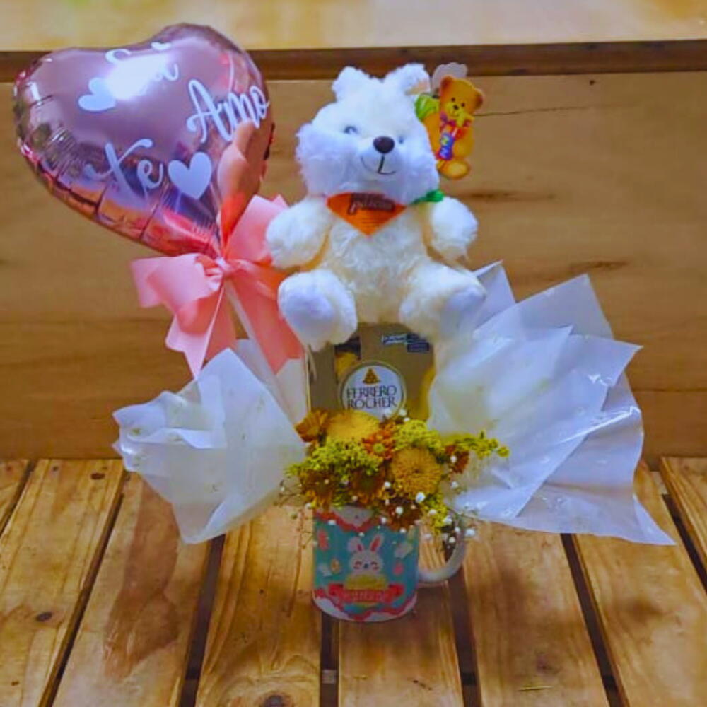 Bouquet de Caneca de Páscoa – Um Presente Completo e Encantador para Celebrar! Surpreenda nesta Páscoa com um presente delicado e cheio de charme, que combina fofura, sabor e beleza natural em uma composição única. O Bouquet de Caneca de Páscoa é perfeito para presentear quem você ama ou para deixar a sua celebração ainda mais especial. O que vem no Bouquet? 1 caneca de cerâmica com a mensagem Feliz Páscoa – ideal para reutilizar e decorar com estilo. 1 coelho de pelúcia de 20 cm – fofura certificada para todas as idades. 1 caixa com 4 bombons Ferrero Rocher – um toque sofisticado e irresistível de chocolate. Mini bouquet de flores do campo – fixadas em esponja floral, trazendo frescor e delicadeza. 1 balão metalizado Eu te amo. Dimensões do Bouquet Altura total: 45 cm Diâmetro: 20 cm Por que escolher o Bouquet de Caneca de Páscoa? Presente completo e versátil: reúne pelúcia, flores naturais e chocolate em uma única embalagem charmosa. Decoração prática e sustentável: a caneca reutilizável é um brinde que dura muito além da Páscoa. Detalhes que encantam: as flores do campo trazem um toque natural e alegre para qualquer ambiente. Sabor refinado: os bombons Ferrero Rocher são a garantia de um momento doce e inesquecível. Celebre a Páscoa com um presente que transmite amor, carinho e sofisticação. Garanta já o seu Bouquet de Caneca de Páscoa e faça desta data uma lembrança cheia de significado! Não deixe para depois! Surpreenda quem você ama com um presente que une fofura, beleza e sabor em cada detalhe.