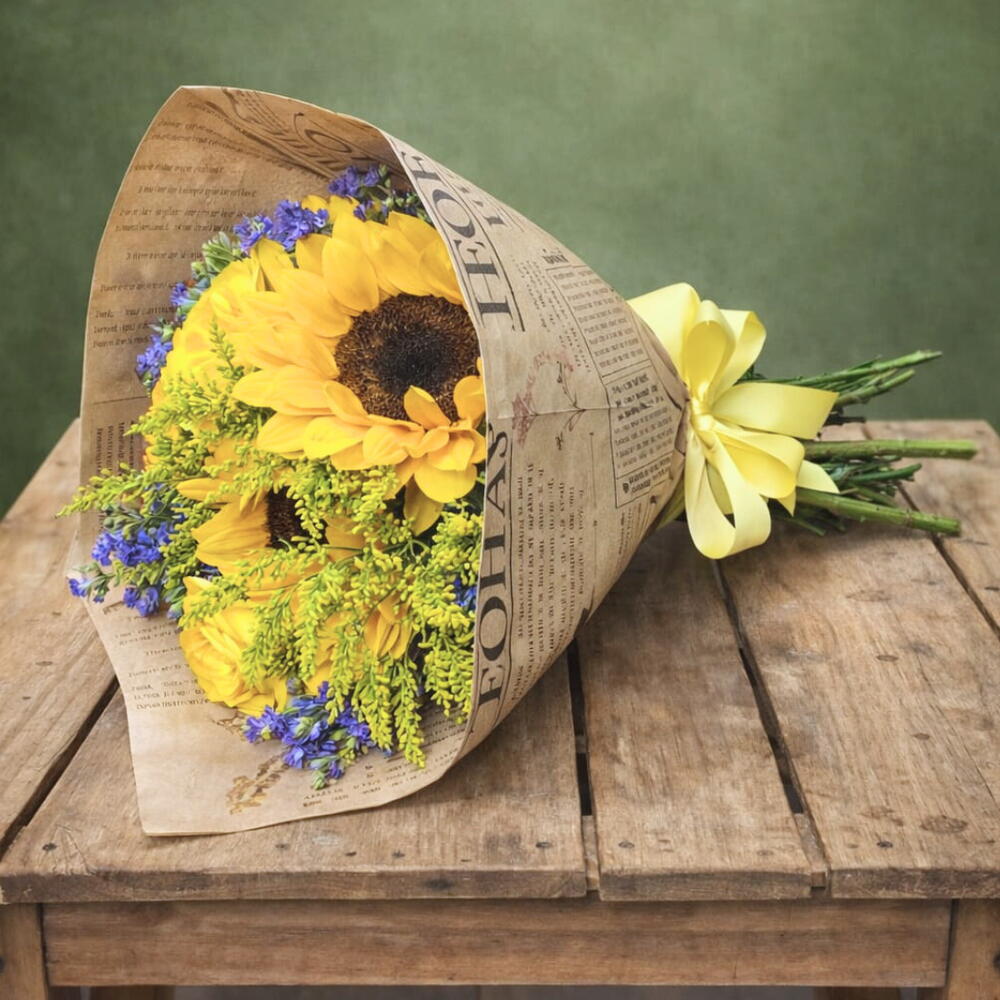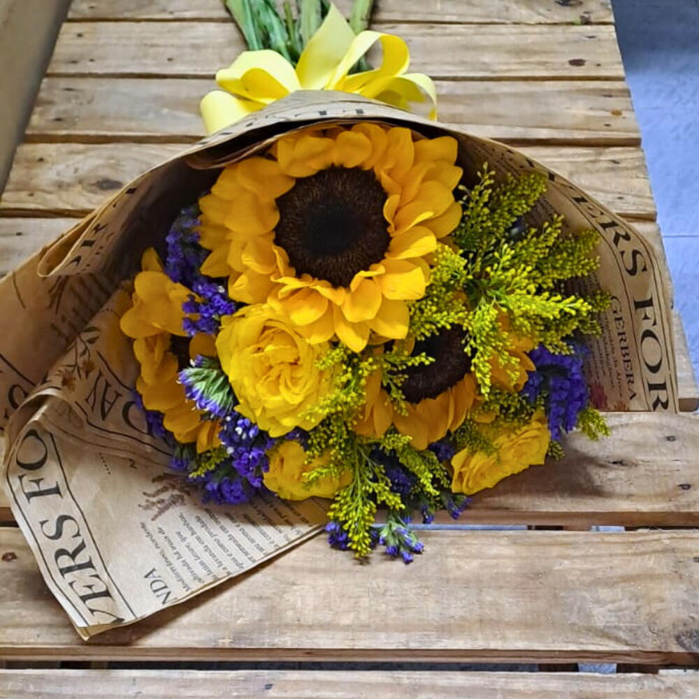 Bouquet de Girassois com Rosas Amarelas e Estatice