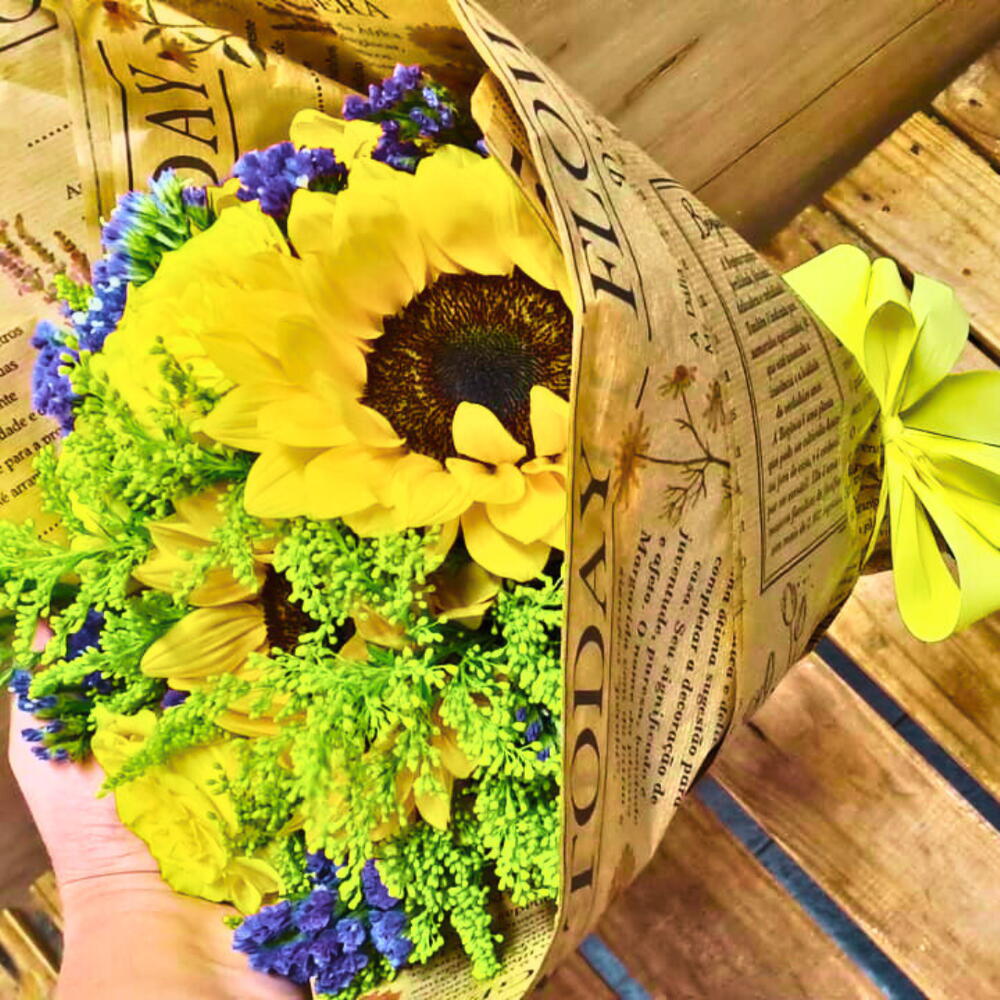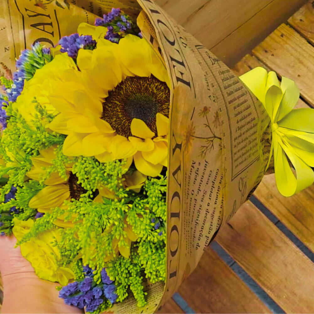 Bouquet de Girassóis com Rosas Amarelas e Estátice – Radiante e Encantador Surpreenda com um presente que irradia alegria e delicadeza! Nosso Bouquet de Girassóis com Rosas Amarelas e Estátice é a escolha perfeita para iluminar qualquer ambiente e emocionar quem você ama. Características do Produto: 3 Girassóis vibrantes: símbolos de luz, felicidade e energia positiva. 3 Rosas amarelas: flores que traduzem amizade, carinho e otimismo. 1 pacote de Estátice: para adicionar textura e beleza ao arranjo. 1 pacote de Tango: complementando a harmonia das flores. Altura aproximada: 50 cm Diâmetro aproximado: 25 cm Por que escolher este bouquet? Este arranjo reúne as cores e formas que transmitem calor humano e alegria, perfeito para celebrar momentos especiais como aniversários, agradecimentos, ou simplesmente para alegrar o dia de alguém querido. A combinação de girassóis com rosas amarelas e Estátice cria um visual vibrante, elegante e cheio de vida. Cuidados para preservar seu bouquet: Mantenha em local fresco e protegido da luz solar direta. Regue com moderação para manter a vitalidade das flores. Evite ambientes muito secos para prolongar a beleza do arranjo. Garanta agora o seu Bouquet de Girassóis com Rosas Amarelas e Estátice e transforme momentos simples em celebrações radiantes. Compre já e espalhe alegria com um presente que fala diretamente ao coração! Porque amor e amizade merecem ser celebrados com cores e flores todos os dias!