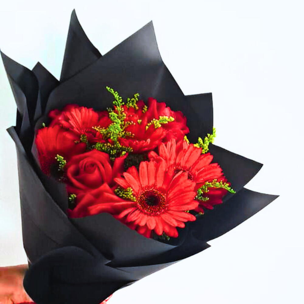 rosa vermelhas - 6 un. gérbera vermelhas - 6 un. maço de tango - 1 un.