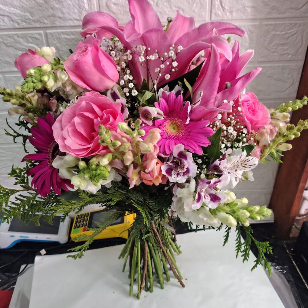 embalagem personalizada - 1 un. mosquitinho - 1 un. gerberas - 3 un. lírio - 3 un. astromelias - 5 un. rosa cor de rosa - 5 un. folhagens selecionadas - 1 un.