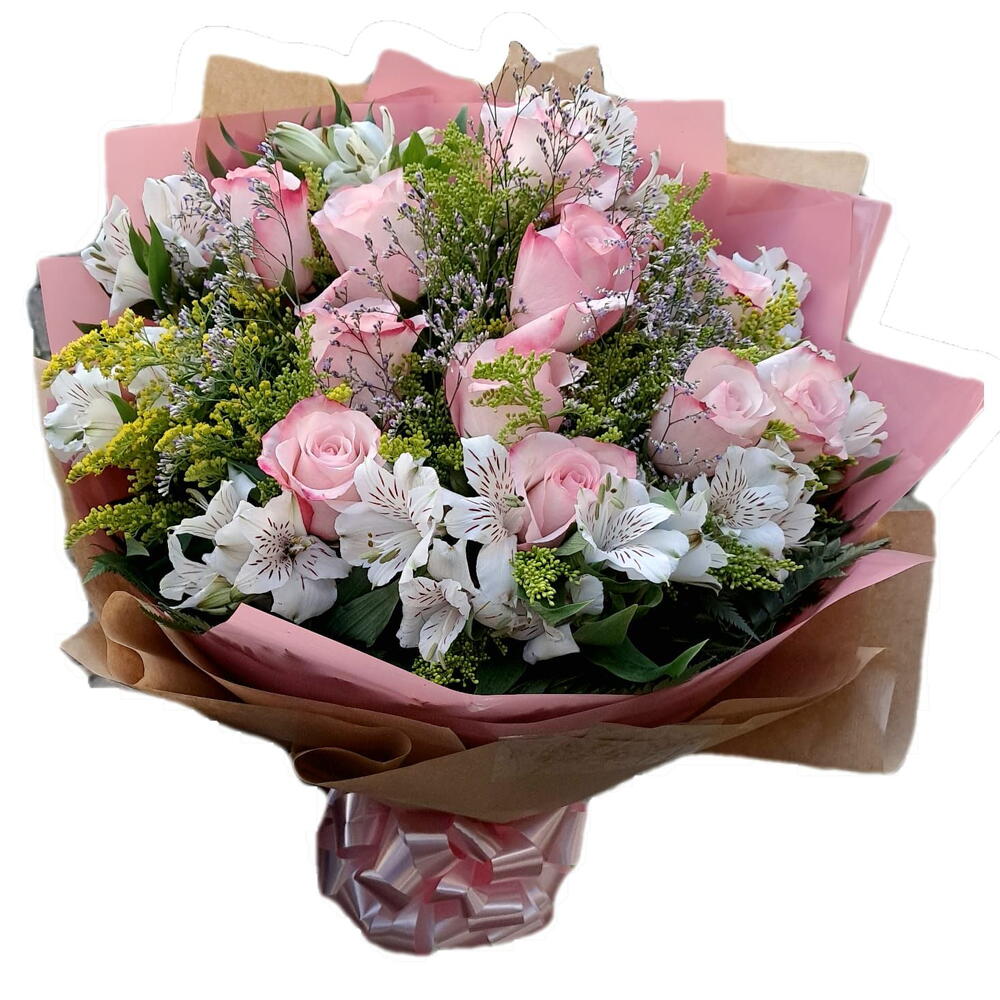 rosa - 12 un. embalagem - 1 un. folhagens - 1 un. laço - 1 un. astroméria - 1 un.