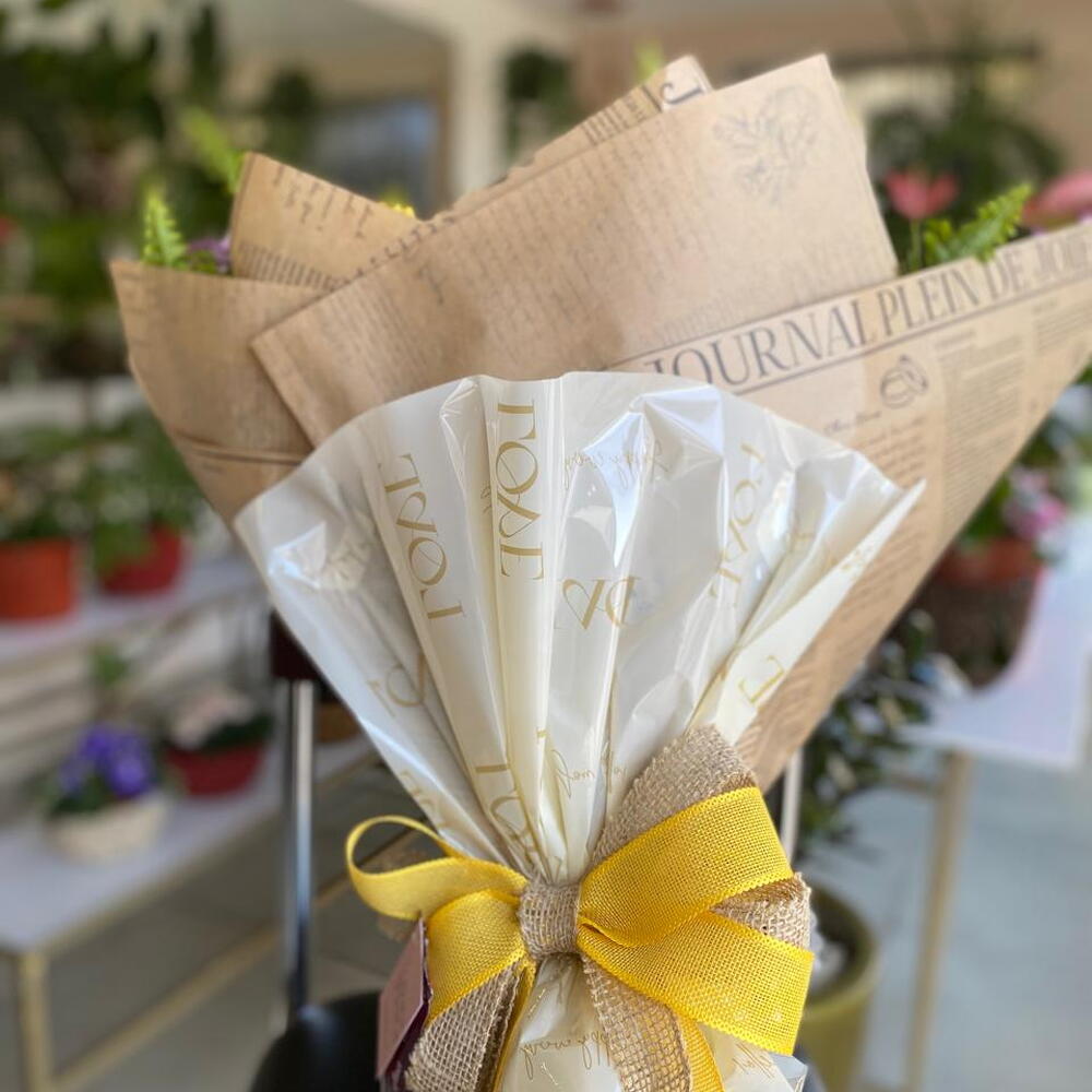 embalagem de designer - 1 un. folhagens - 1 un. rosa amarelas - 12 un. laço - 1 un.