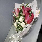 embalagem de designer - 1 un. rosa branca - 3 un. folhagens - 1 un. laço - 1 un. lírio (cor disponível no dia) - 3 un.