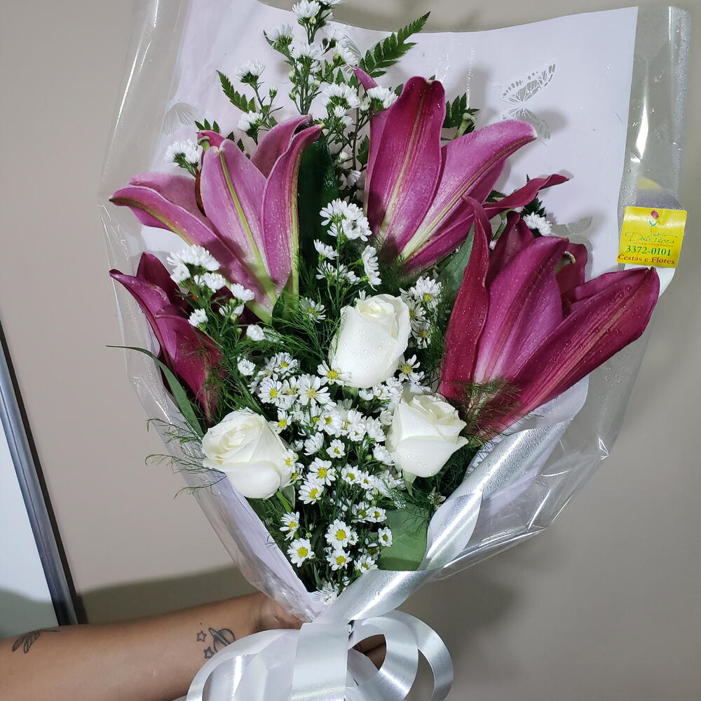 Este lindo buquê é cuidadosamente composto por 3 rosas brancas elegantes, representando pureza e amor sincero, e 3 lírios, cuja cor disponível será escolhida com todo o cuidado no dia do seu pedido. Cada pétala é escolhida para trazer um toque de sofisticação e exclusividade à sua ocasião. Um presente memorável de beleza duradoura e um tributo verdadeiro ao amor e à apreciação.
