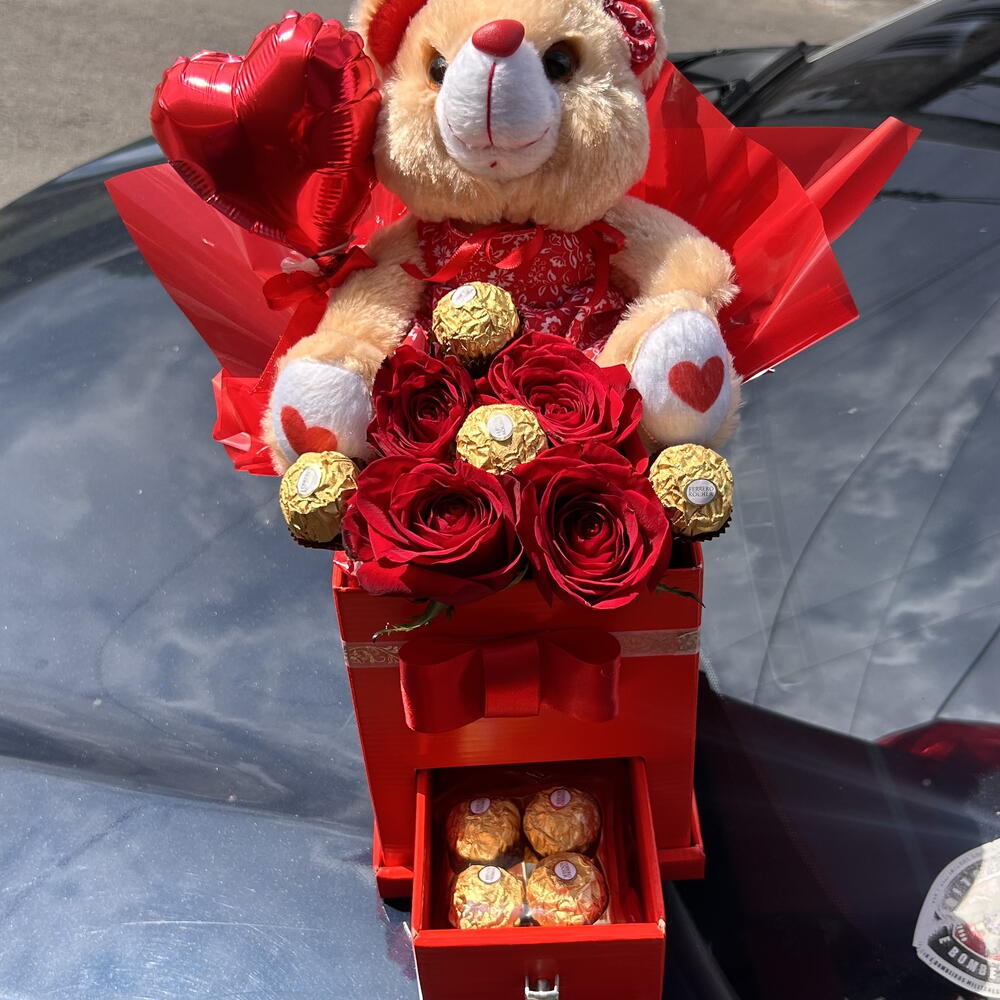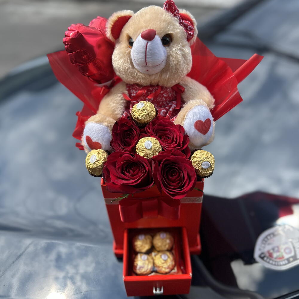 Este kit de presente é composto por um elegante box com gaveta, que abriga pequenos tesouros para criar momentos inesquecíveis. Dentro, você encontrará 8 deliciosas unidades de Ferrero Rocher, famosas por suas camadas crocantes e recheio cremoso. Alegrando ainda mais a ocasião, o kit conta com 4 delicadas rosas e um fofo peluche que promete derreter corações. Para arrematar, uma embalagem sofisticada e um mini balão para adicionar uma dose extra de surpresa e emoção. Cada detalhe foi pensado para dar brilho a ocasiões especiais.
