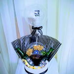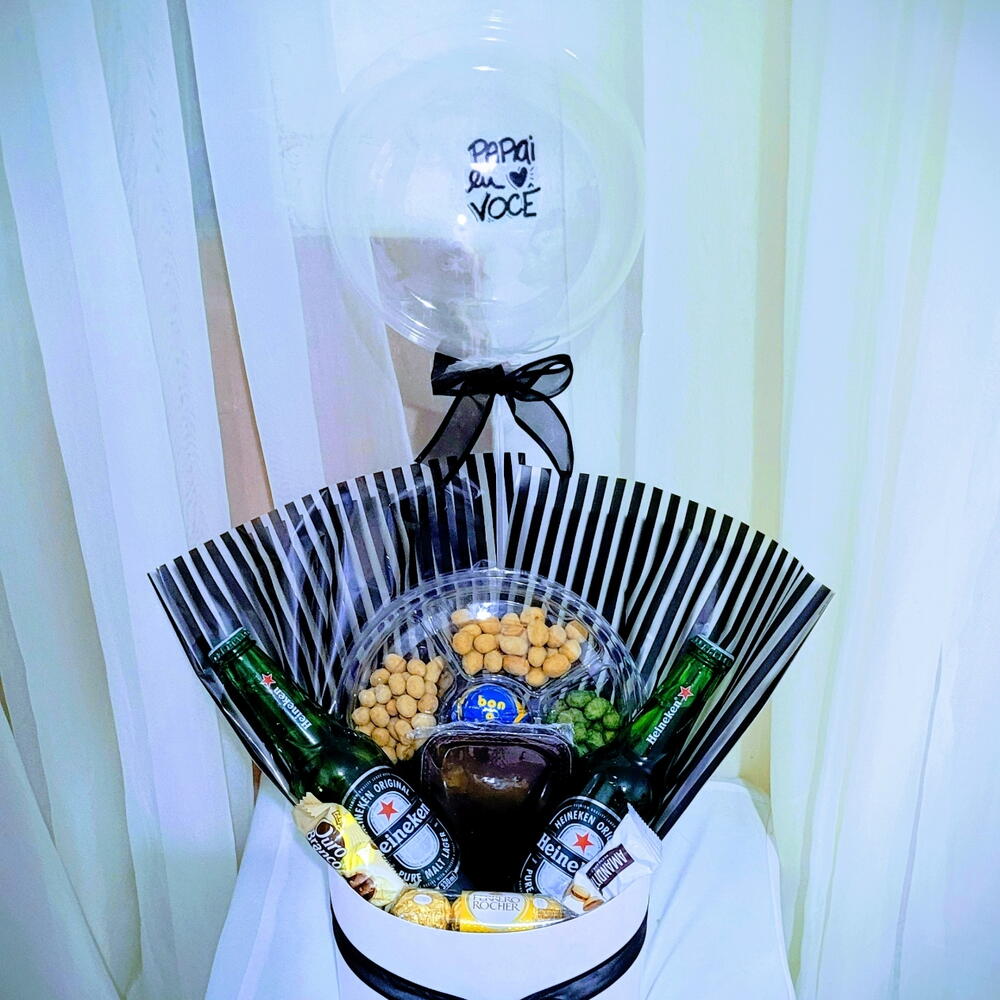 laço de cetim. - 2 un. long neck heineken - 2 un. embalagem sacola celofane - 1 un. caixa acartonada 20x15 - 1 un. ferrero rocher pct com 3 unidades - 1 un. petiskeira com amendoins sabores diversos - 1 un. balão bubbke 20 cm - 1 un. chocolates lacta diversos - 2 un.