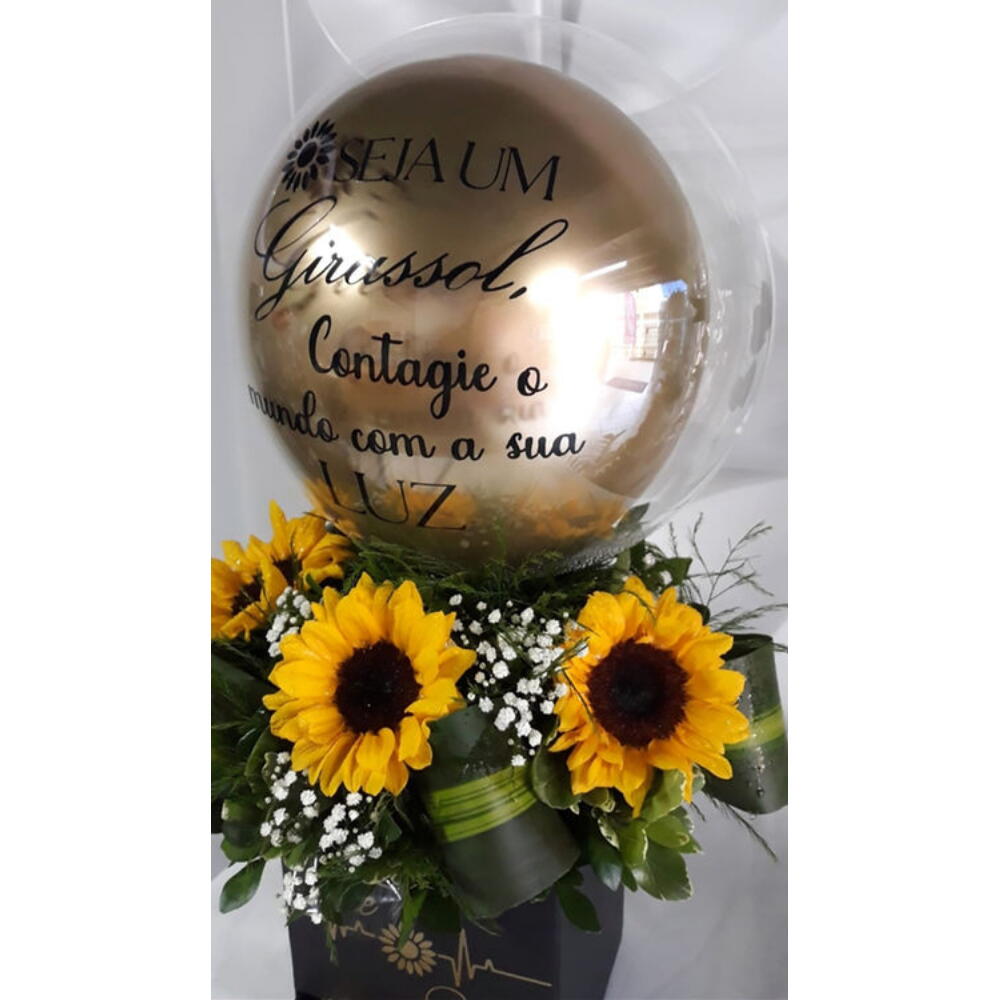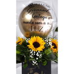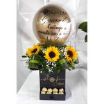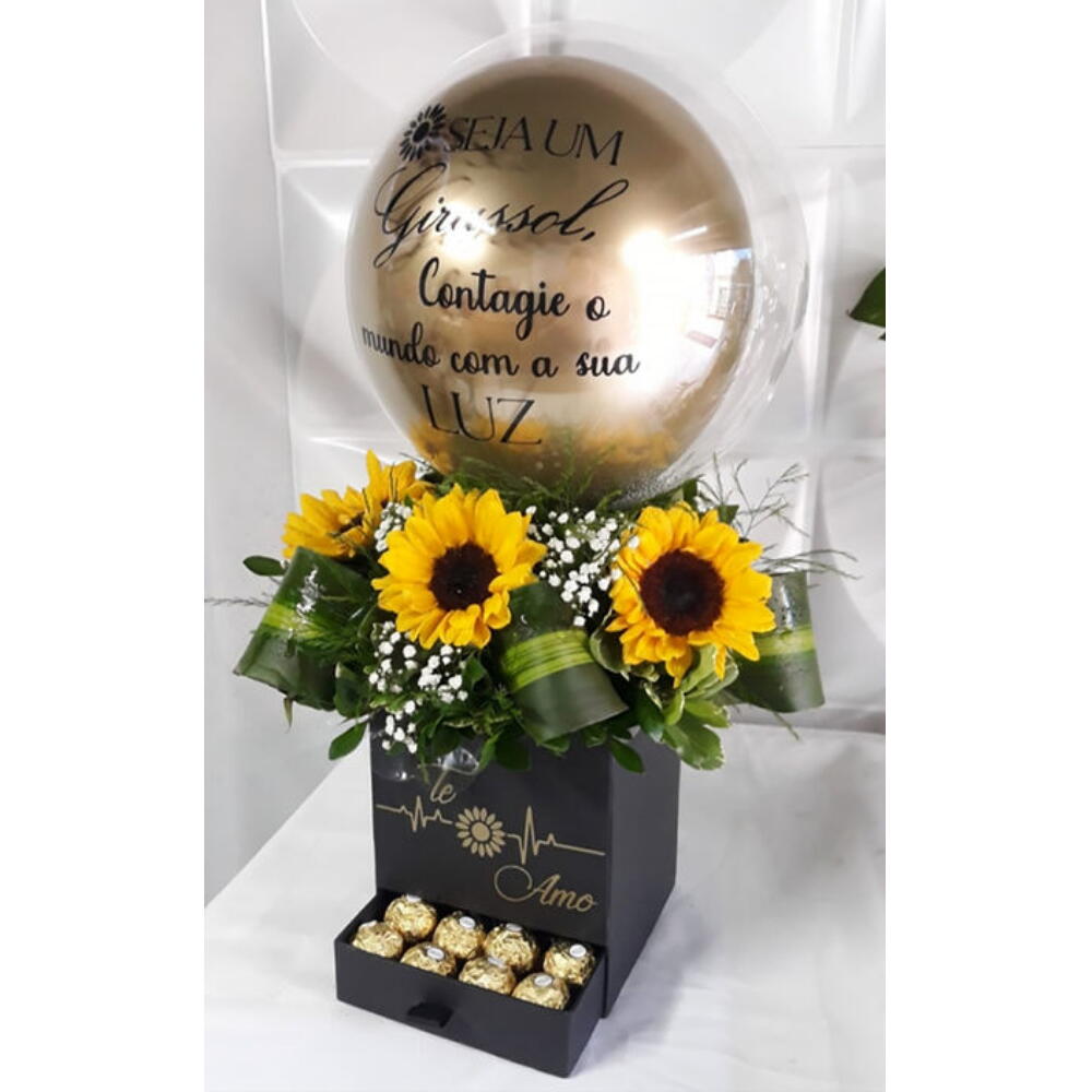 Este presente com chocolate exclusivo é um gesto doce e alegre que deixará o dia de alguém especial. A combinação vibrante de três girassóis e uma folhagem harmoniza-se perfeitamente com oito deliciosos chocolates Ferrero Rocher, proporcionando uma explosão de sabores e cores. O mimo é completado com uma caixa personalizada te amo e um Bumbble 9 customizado, demonstrando seu carinho e cuidado em cada detalhe. O presente perfeito para surpreender e encantar quem você ama!