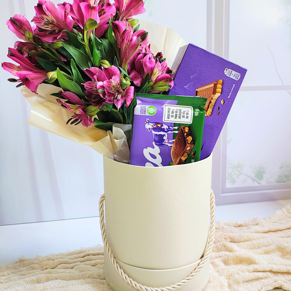 Um presente pensado para transformar pequenos gestos em grandes emoções. Dentro da nossa box, você encontrará um delicado buquê de flores astromélias, nas cores disponíveis do dia, biscoitos milka, chocolate milka, para presentear com um doce mimo pessoas especiais. Finalizado com uma charmosa box e um cartão fino para eternizar sua mensagem.