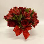 box - 1 un. folhagens - 1 un. astroméria - 5 un. rosa vermelhas - 5 un. laço em cetim - 1 un.